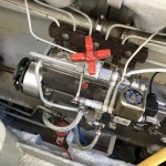 Het expansievat van het koelwater-systeem zit weer vast op het inlaatspruitstuk. Hans Geurts heeft de beugel gerepareerd en er een tweede beugel bijgemaakt. Kai heeft de brandstofpomp weer op de motor gemonteerd. We hebben koelvloeistof en smeerolie (in brandstofpomp) bijgevuld. De motor startte direct weer! De koppelingen van de brandstofleidingen lekte nog hier en daar, dat ga ik de komende dagen oplossen.