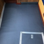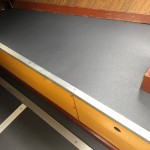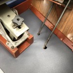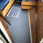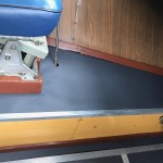 Het oude vloerzeil vervangen door nieuwe, Arn heeft meegeholpen. Het voorste gedeelte van de vloer was zeil met houtstructuur. Ik heb ervoor gekozen om overal grijs zeil te gebruiken. De houten luiken heb ik volledig nagemaakt zodat er geen onnodige gaten meer in zitten. De aluminium strippen zijn origineel, deze heb ik opgepoest.