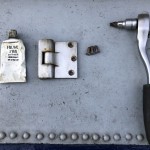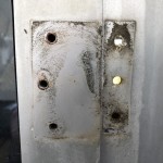 Twee schanieren vervangen aan bakboordzijde. De schanieren zitten van binnenuit met 3 bouten vast. De middelste bouten zijn korter. Twee bouten waren van ijzer de andere van RVS, de ijzeren bouten braken helaas af. Zo te zien zijn ze aan stuurboordzijde allemaal van ijzer. De schanieren kunnen verkeerd gemonteerd zijn, de nummers aan de achterzijde moeten van beide delen gelijk geörienteerd zijn (zie foto).