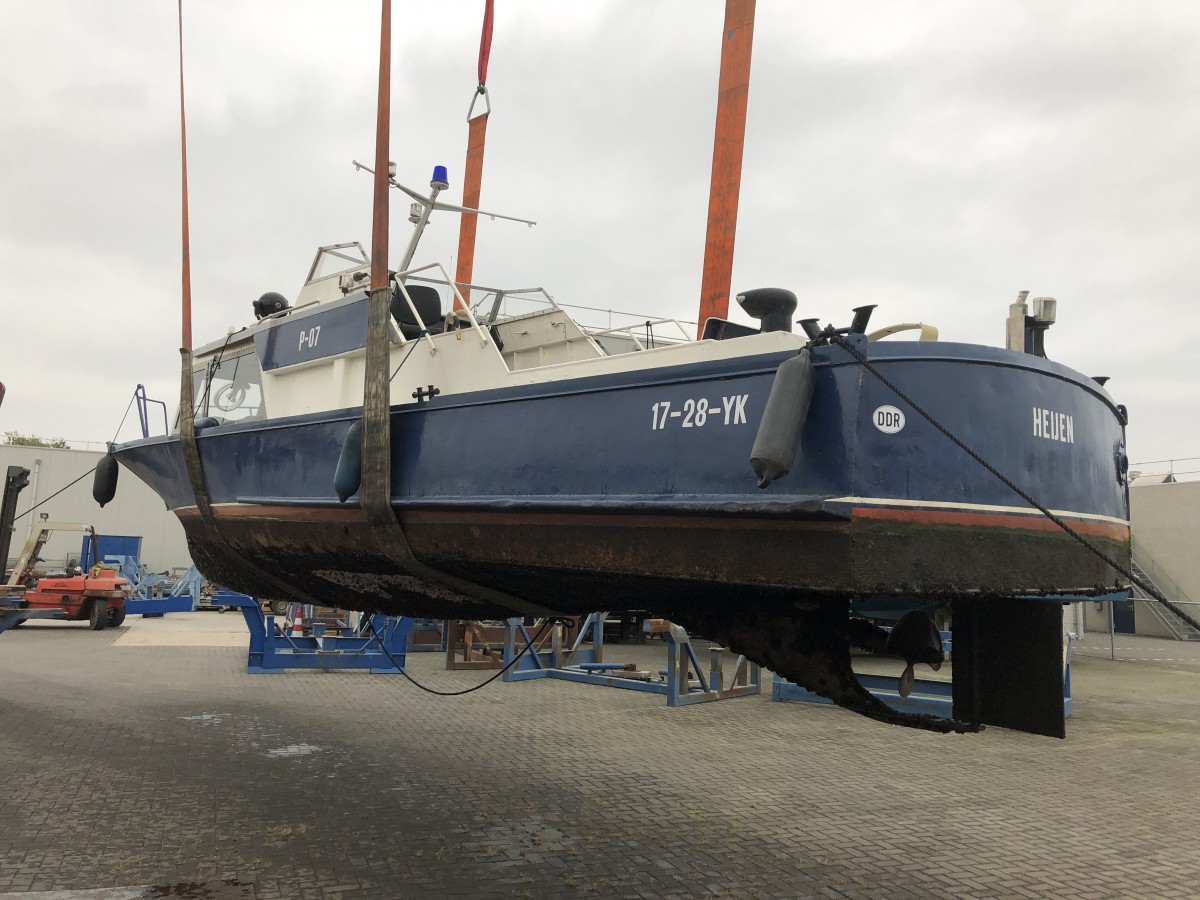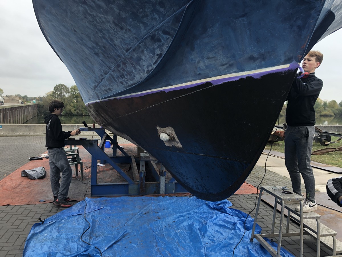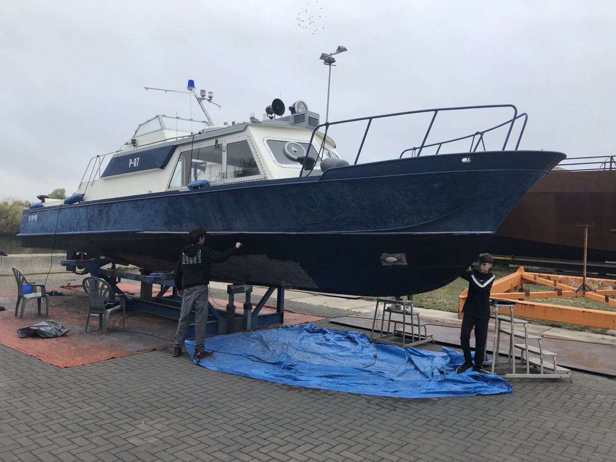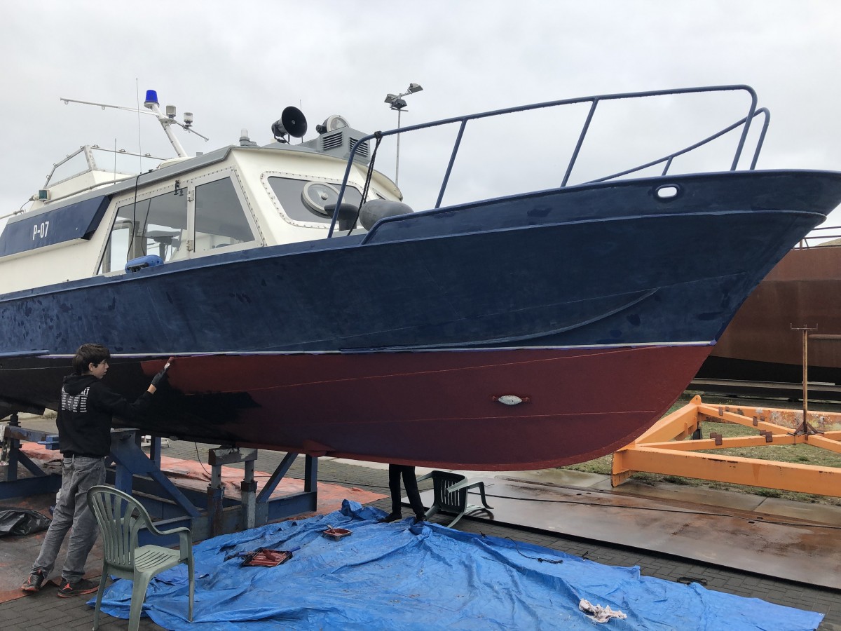 De P-07 is uit het water geweest bij Scheepswerf van Wezel. Na een week werken met hulp van Sam, Thijn en Stein zit er weer nieuwe coating, antifouling en lak op de romp! De werf heeft de romp schoongemaakt met hoge druk. Daarna hebben Sam en ik alles met een staalborstel en schuurpapier schoongemaakt. De kale plekken hebben we met coating behandeld, daarna twee nieuwe lagen coating en twee lagen antifouling.