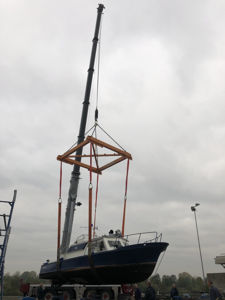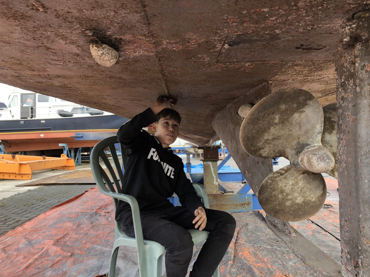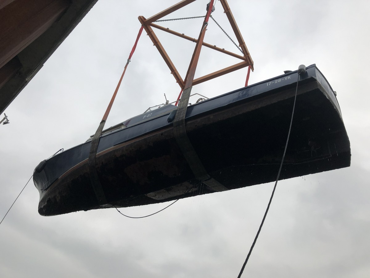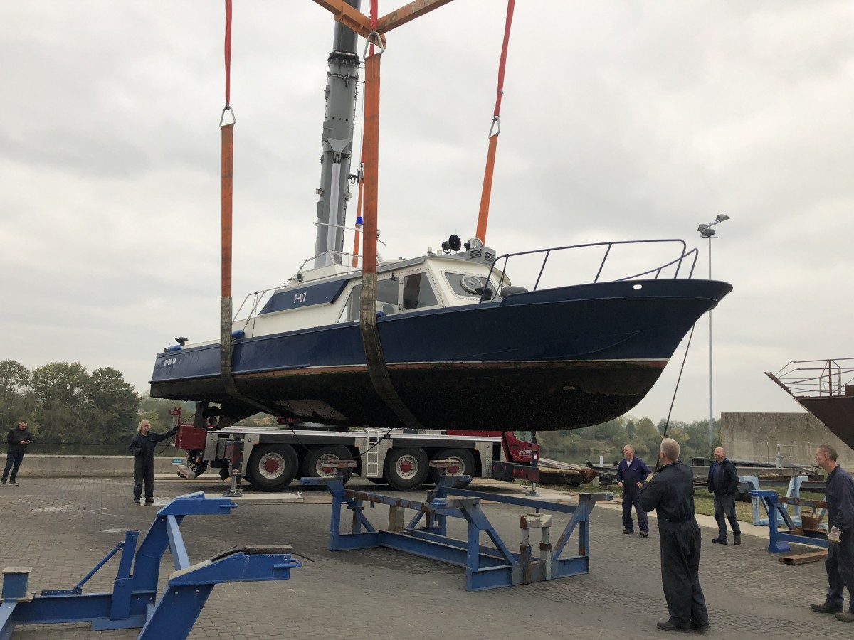 De P-07 is uit het water geweest bij Scheepswerf van Wezel. Na een week werken met hulp van Sam, Thijn en Stein zit er weer nieuwe coating, antifouling en lak op de romp! De werf heeft de romp schoongemaakt met hoge druk. Daarna hebben Sam en ik alles met een staalborstel en schuurpapier schoongemaakt. De kale plekken hebben we met coating behandeld, daarna twee nieuwe lagen coating en twee lagen antifouling.