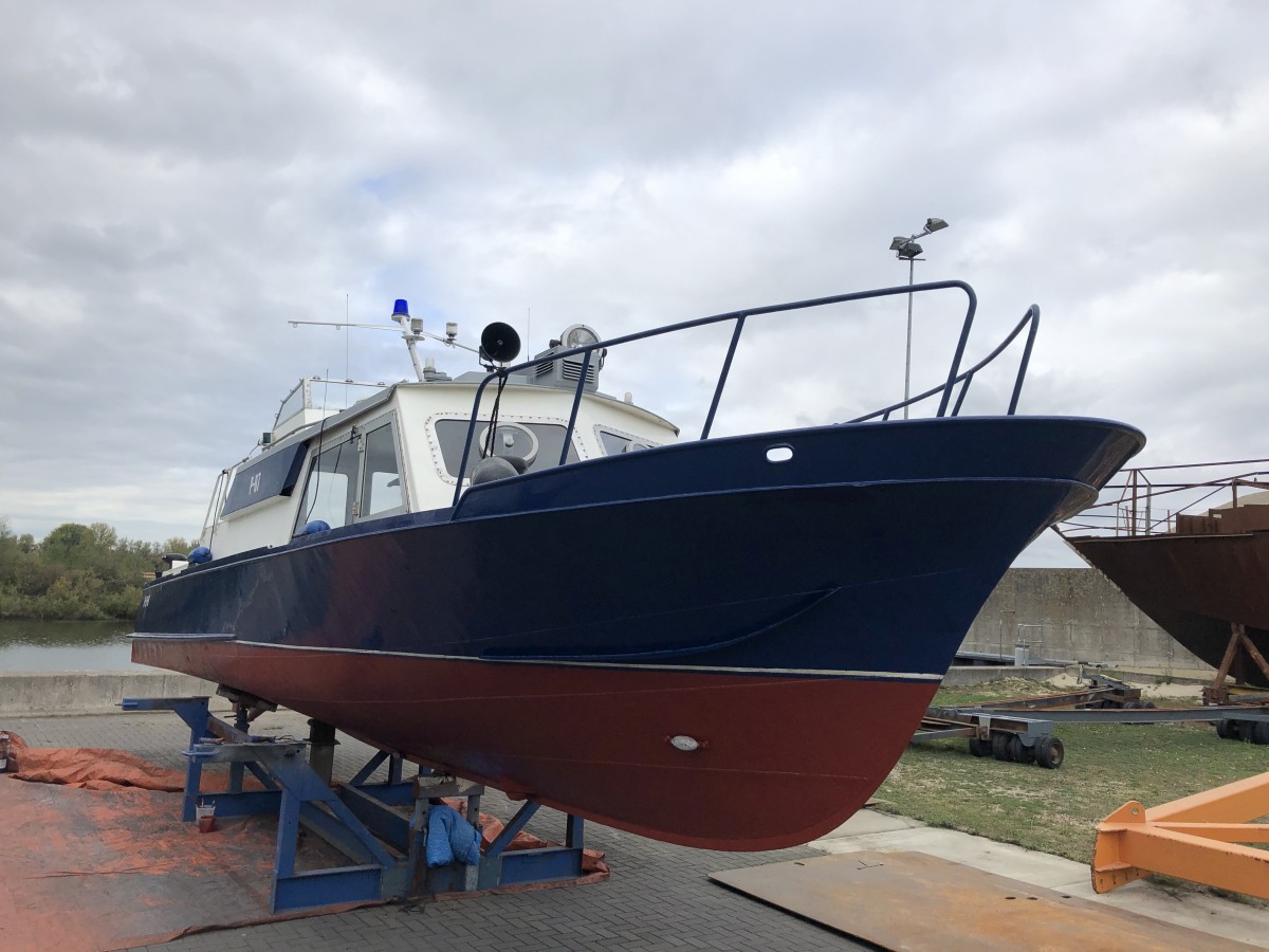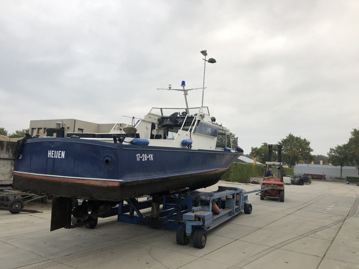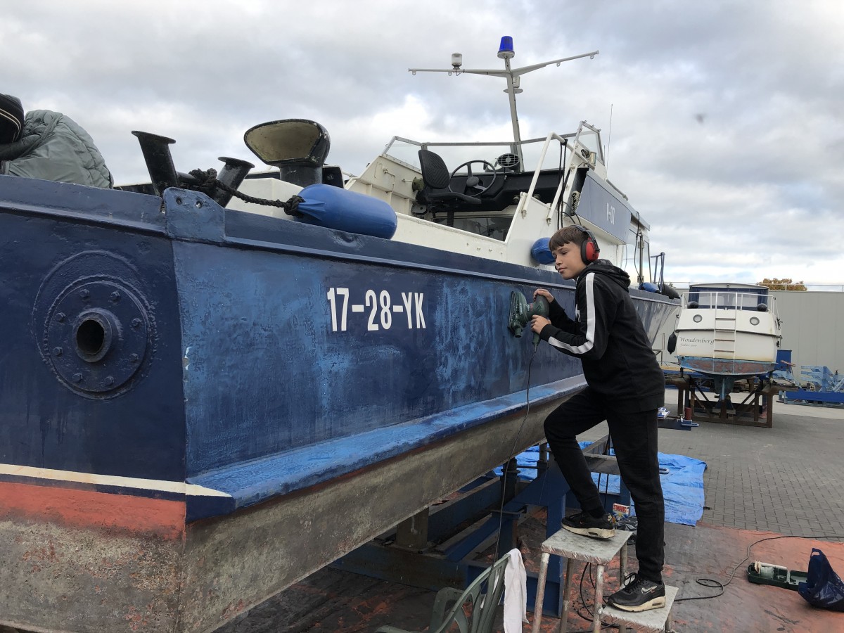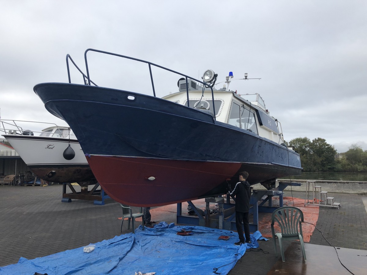 De P-07 is uit het water geweest bij Scheepswerf van Wezel. Na een week werken met hulp van Sam, Thijn en Stein zit er weer nieuwe coating, antifouling en lak op de romp! De werf heeft de romp schoongemaakt met hoge druk. Daarna hebben Sam en ik alles met een staalborstel en schuurpapier schoongemaakt. De kale plekken hebben we met coating behandeld, daarna twee nieuwe lagen coating en twee lagen antifouling.